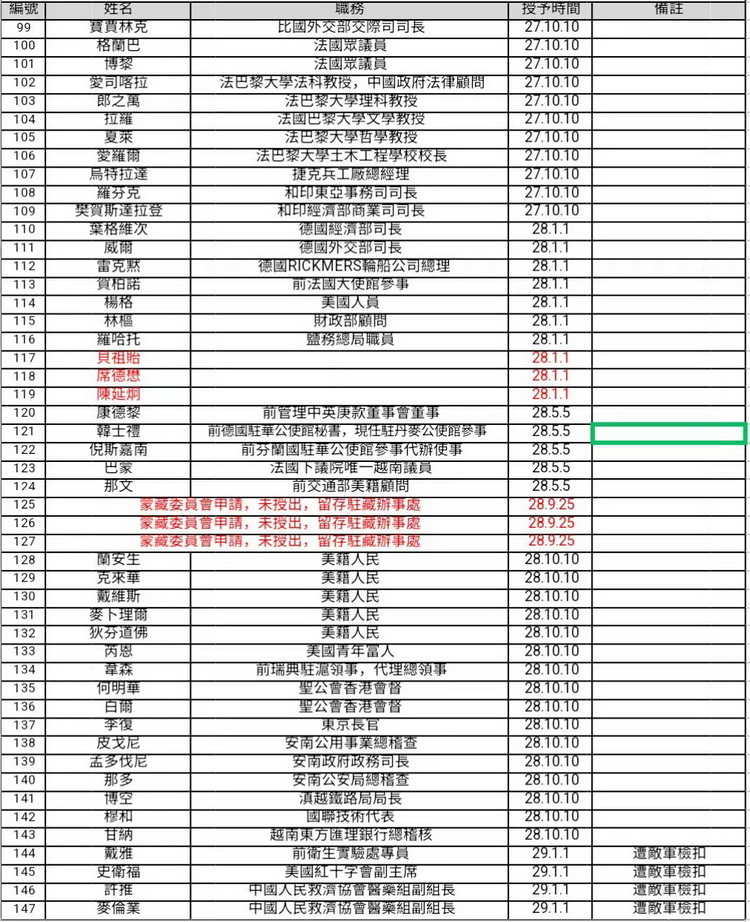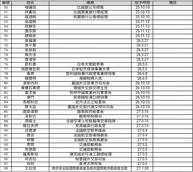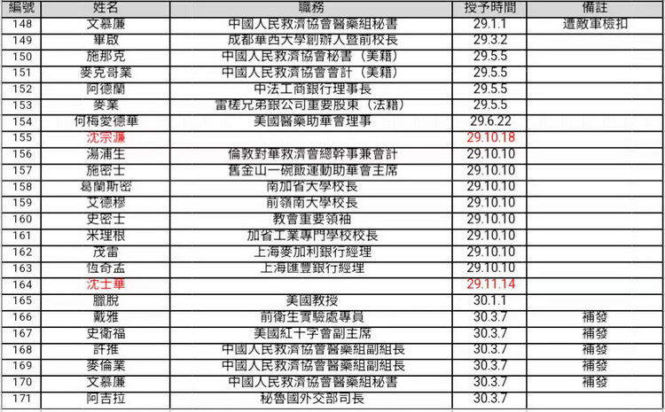 本清册所有黑色字体序号均有明确的档案扫描件支持;红色为暂未有明确档案支持,但根据授予命令时间及顺序缺位对应,虽然前期整理时部分因后续发现明确文件而确认准确,可以认为其余准确性同样较高,但仍然不能排除可能错乱,仅因此此一部分仅供参考。